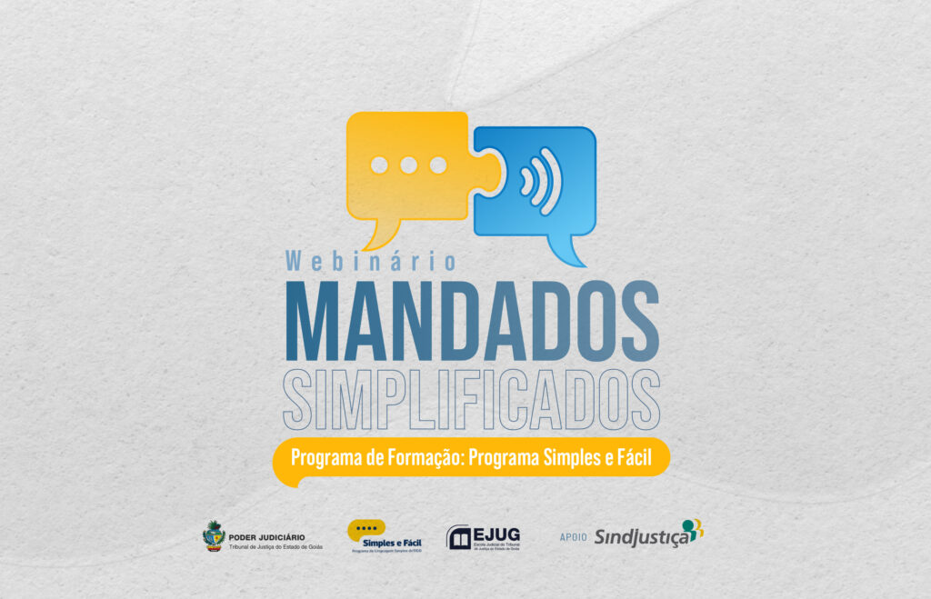 O Tribunal de Justiça do Estado de Goiás, por meio do Simples e Fácil, Programa de Linguagem Simples do TJGO; e da Escola Judicial de Goiás (EJUG), com o apoio do SINDJUSTIÇA, realizará nesta quinta-feira, 24 de julho, das 14h às 15h, o webinário “Mandados Simplificados”.